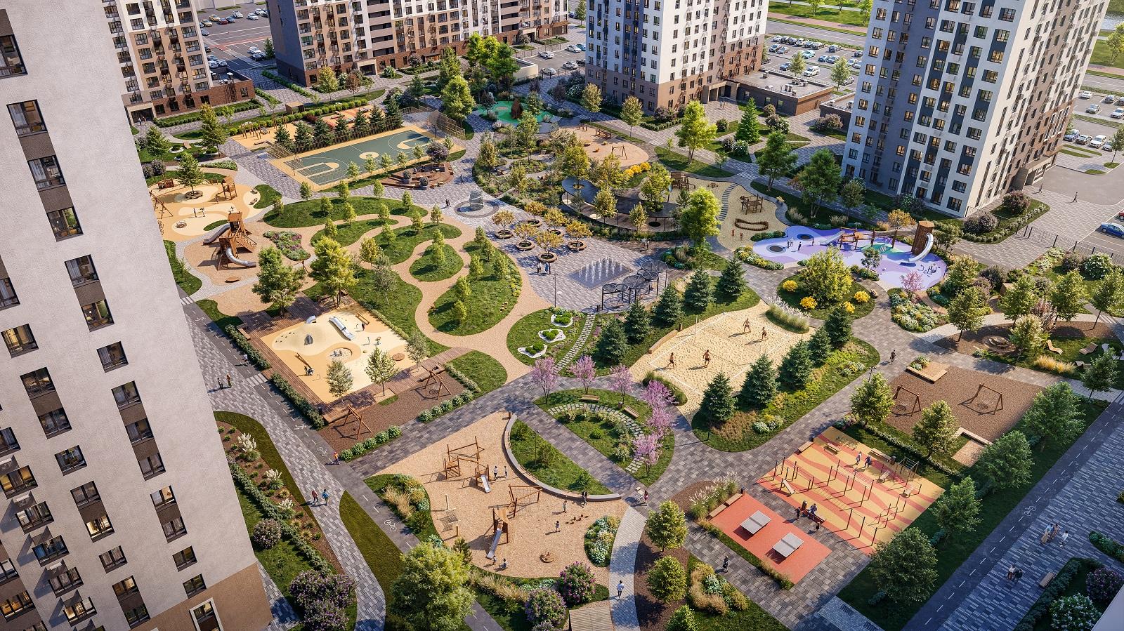 Внутреннее пространство комплекса — это многофункциональный общественный центр: детские и спортивные площадки, фонтаны, зоны отдыха, арт-объекты и ландшафтные инсталляции. Пространство живое, зелёное и безопасное. Пешеходные маршруты плавно перетекают в тематические зоны: игровую, спортивную, семейную и тихую для отдыха. Каждая деталь двора разработана с заботой о людях разных возрастов и потребностей.