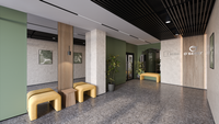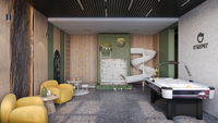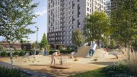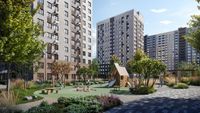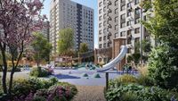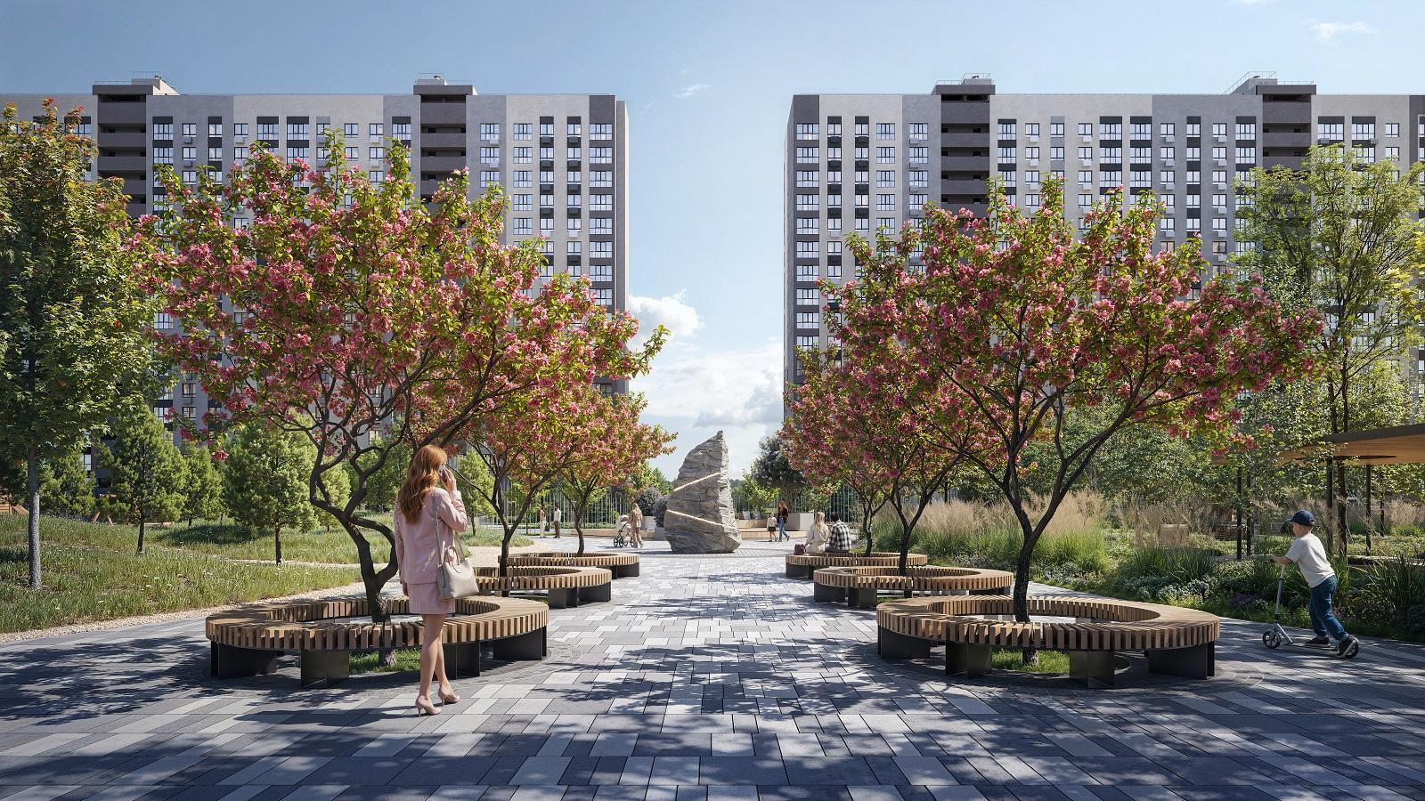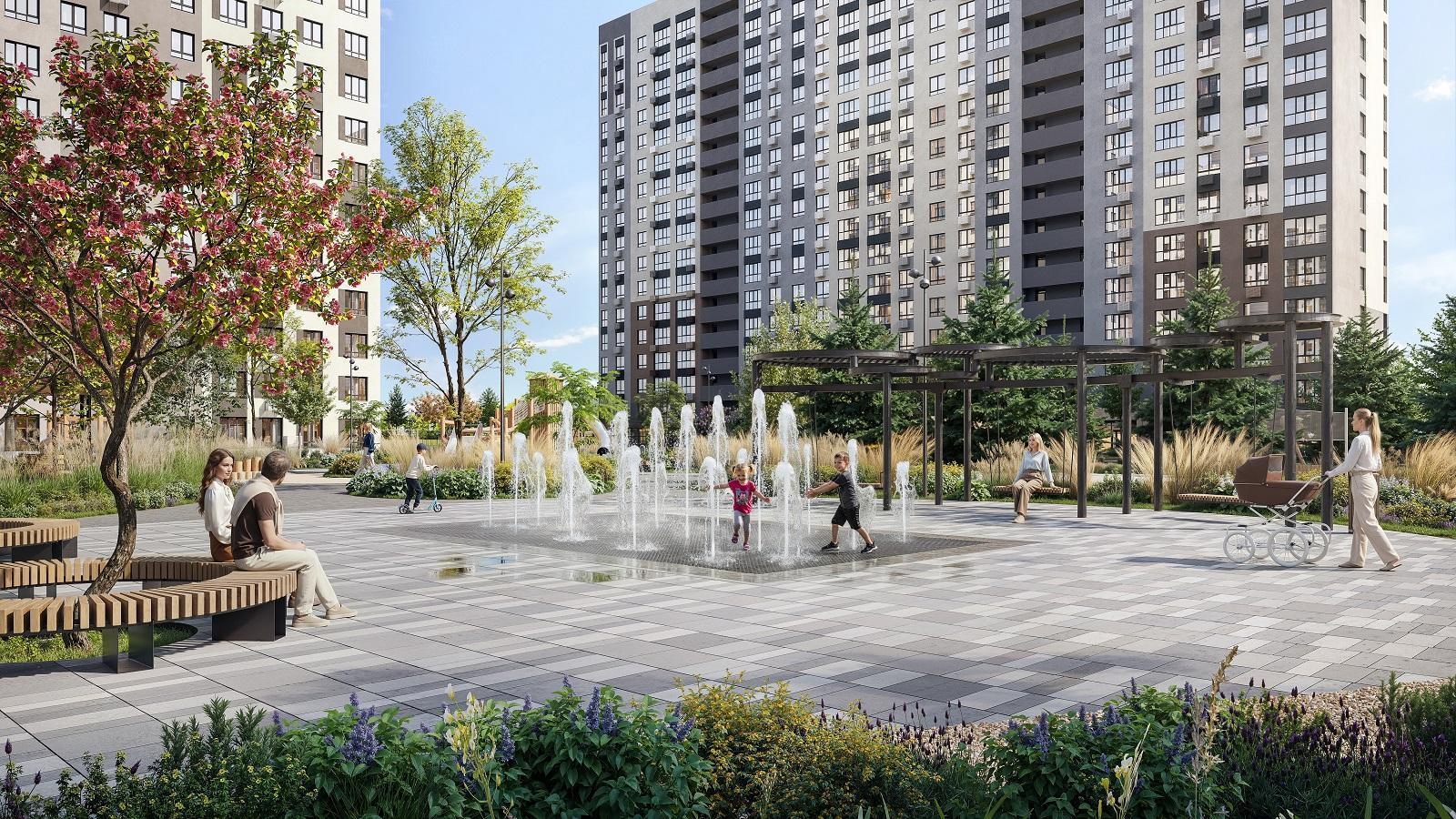 Внутреннее пространство комплекса — это многофункциональный общественный центр: детские и спортивные площадки, фонтаны, зоны отдыха, арт-объекты и ландшафтные инсталляции. Пространство живое, зелёное и безопасное. Пешеходные маршруты плавно перетекают в тематические зоны: игровую, спортивную, семейную и тихую для отдыха. Каждая деталь двора разработана с заботой о людях разных возрастов и потребностей.